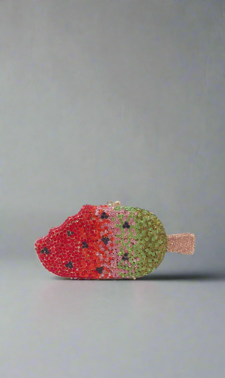 Sweet, sparkly, and impossible to ignore—this popsicle-shaped crystal clutch is the ultimate statement accessory. Fully encrusted with colorful rhinestones in watermelon-inspired hues, it features a bite-mark detail for a fun twist and a detachable chain strap so you can wear it as a clutch or shoulder bag.