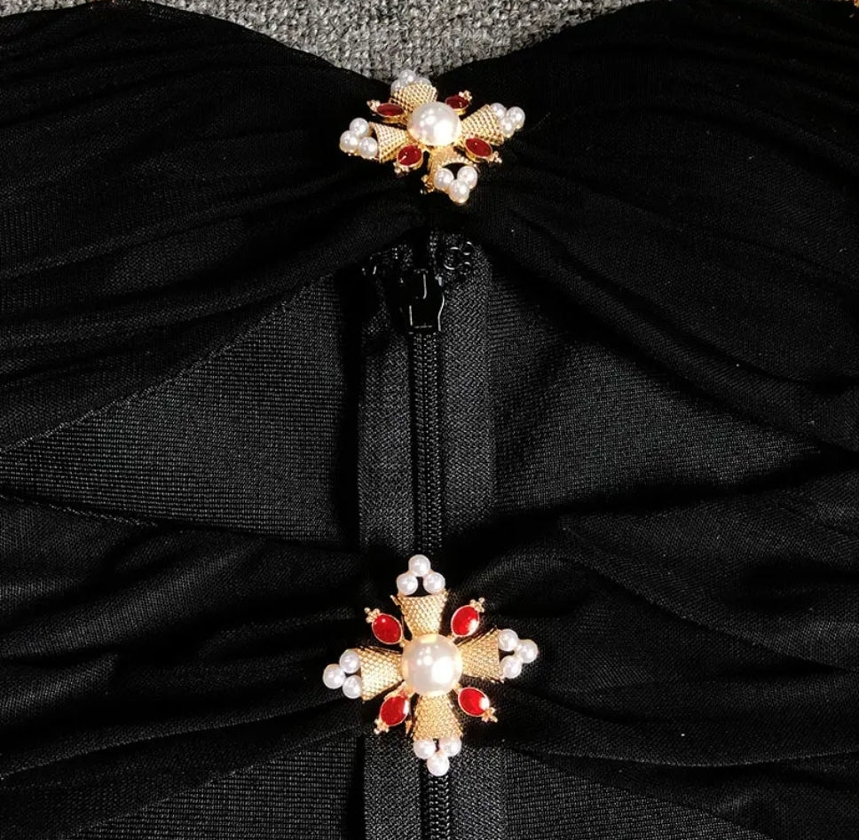 A chic black midi dress featuring a front cutout, gold chain strap detail, and crystal-embellished accents. Finished with a thigh-high slit for a sleek, glamorous evening look.